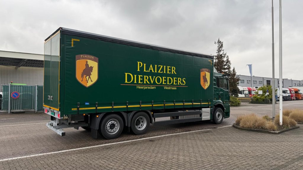 Geleverd aan Van Leeuwen Truck Service voor Plaisier diervoeders een schuifzeil carrosserie op een MAN TGS 6×2 Truck chassis